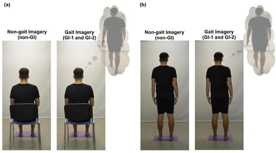 - Kolářová, B.; Krobot, A.; Polehlová, K.; Hluštík, P.; Richards, J. Effect of Gait Imagery Tasks on Lower Limb Muscle Activity With Respect to Body Posture. Percept. Mot. Skills 2016, 122, 411–431. [Google Scholar] [CrossRef]