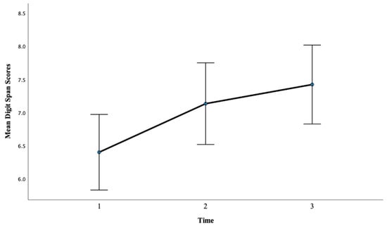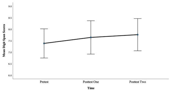 There was a significant main effect of time on Digit Span scores, F(2, 88) = 6.31, p < 0.01, η2 = 0.13. Pairwise comparisons showed that there was not a significant difference between pretest mean scores (M = 6.40) and posttest one mean scores (M = 7.13), p = 0.06, with a large effect, d = 2.41. However, there was a significant difference between pretest mean scores (M = 6.40) and posttest two mean scores (M = 7.42), p < 0.01, with a large effect, d = 3.39. This finding suggests that more hours of training lead to greater gains on WM scores as evidenced by a larger effect size after 12 h of training compared with 6 h of training for this condition. In addition, the pre- to posttest two difference was the only significant difference regarding time for Digit Span scores in this condition, suggesting that for this specific measure, more hours of training were required to produce an effect. See Figure 5 below.