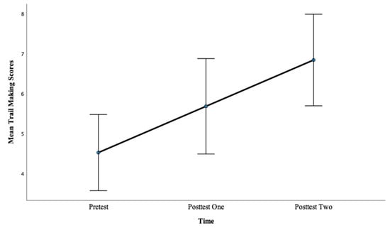 For the Trial Making task, there was a significant main effect of time, F(2, 98) = 8.48, p < 0.001, η2 = 0.15. Pairwise comparisons showed that there was a significant difference between pretest mean scores (M = 4.52) and posttest one mean scores (M = 5.68), p < 0.05, with a large effect, d = 2.10. Also, there was a significant difference between pretest mean scores (M = 4.52) and posttest two mean scores (M = 6.84), p < 0.001, with a large effect, d = 4.30. This finding suggests that more hours of training lead to greater gains on CF as evidenced by a larger effect size after 12 h of training. See Figure 2 below.