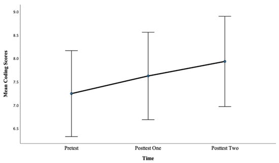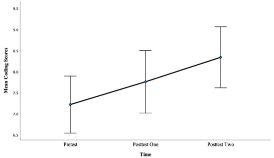 For Coding scores, there was a significant main effect of time, F(2, 98) = 9.30, p <0.001, η2 = 0.16. Pairwise comparisons showed that there was a significant difference between pretest mean scores (M = 7.22) and posttest one mean scores (M = 7.76), p < 0.05, with a large effect, d= 2.13. Also, there was a significant difference between pretest mean scores (M = 7.22) and posttest two mean scores (M = 8.34), p < 0.001, with a large effect, d = 4.01. This finding suggests that more hours of training lead to greater gains in PS scores as evidenced by a larger effect size after 12 h of training compared with 6 h of training. See Figure 3 below.