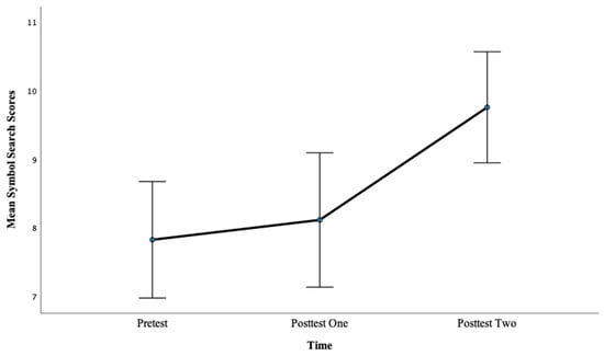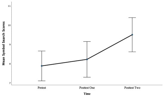 Similarly, for Symbol Search scores, there was a significant main effect of time, F(2, 98) = 9.38, p < 0.001, η2 = 0.16. Pairwise comparisons showed that there was not a significant difference between pretest mean scores (M = 7.88) and posttest one mean scores (M = 8.22), p = 0.41, with a large effect, d = 0.83. However, there was a significant difference between pretest mean scores (M = 7.88) and posttest two mean scores (M = 9.50), p < 0.001, with a large effect, d = 4.09. This finding suggests that more hours of training lead to greater gains in PS scores as evidenced by a larger effect size after 12 h of training compared with 6 h of training. In addition, the pre- to posttest two difference was the only significant difference regarding time for Symbol Search in this condition, suggesting that for this specific measure, more hours of training were required to produce an effect. See Figure 4 below.