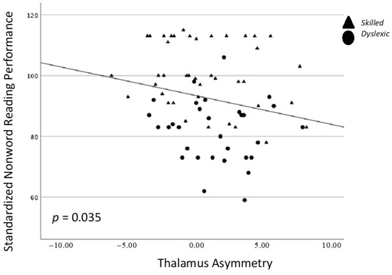 There was a single significant correlation between thalamus asymmetry and TOWRE PDE, whereby stronger leftward asymmetry values were associated with higher TOWRE PDE scores (p = 0.035; Figure 2). This relationship was not significant for either group alone. There were no other significant relationships between behavior and structure asymmetry (Table 2).
