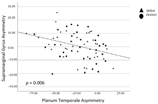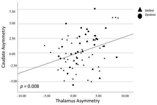 We extend previous work on the lateralization of function [16] via the examination of the lateralization of the structure. Interestingly, we found that the asymmetry of the planum temporale was positively correlated with the asymmetry of the supramarginal gyrus. That is, as one region became more left-lateralized, so too did the other region. We also found that the asymmetry of the caudate and the thalamus was negatively correlated, such that greater leftward asymmetry of one structure was related to more rightward asymmetry of the other structure. These two findings, namely cortical–cortical and subcortical–subcortical, have not yet been reported in the literature for either skilled or dyslexic readers and provide unique information on the potential co-development of these structural regions. Future work that examines functional connectivity between these regions is also needed to provide further characterization of how the brain networks contribute to skilled and impaired reading processes.