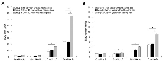 In order to examine the impact of aging and hearing loss on postural control, we performed a Kruskall–Wallis analysis of variance between the 3 groups (18–25 years without hearing loss; over 40 years without hearing loss; over 40 years with hearing loss) in the 4 postural conditions (condition A: eyes open/surface firm; condition B: eyes closed/surface firm; condition C: eyes open/foam; condition D: eyes closed/foam). Kruskall–Wallis tests were also conducted to reveal any changes in sensory reliance between the three groups. Dunn–Bonferroni post-hoc tests were conducted when appropriate.