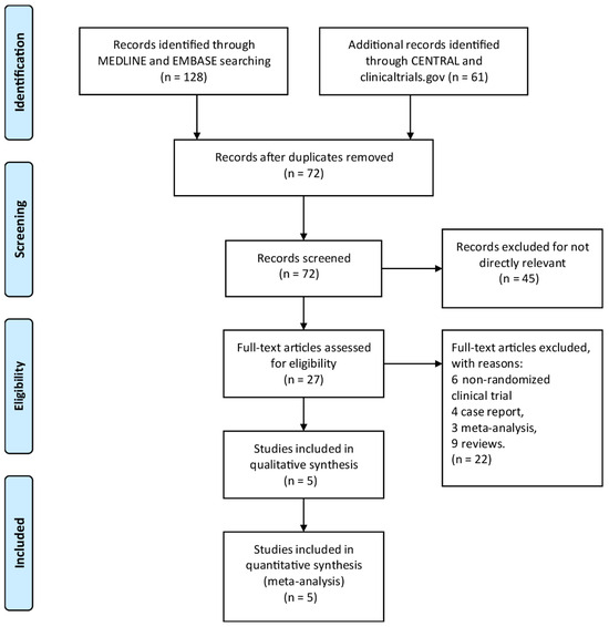 By searching through EMBASE, Cochrane Library, MEDLINE, and Clinicaltrials.gov, a total of 189 titles and abstracts were returned. Moreover, a total of 162 articles were excluded for irrelevance to the research topic and duplication by screening article titles and abstracts, and 27 full-text articles were assessed as qualified. Of the aforementioned 27 articles, 22 articles were excluded due to inappropriate publication types, including 4 case reports, 6 non-randomized clinical trials, 3 meta-analyses, and 9 reviews. The detailed article selection process is summarized in the flowchart (Figure 1). Finally, we include a total of five RCTs [18,23,24,25,26] with 1619 patients enrolled. Table 1 is a summary of the main features of the five studies.