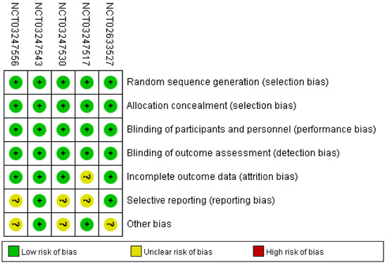 The Review Manager 5.3 software was applied to evaluate the risk of bias for every study. Bias, also known as a systematic error, refers to the tendency of a research result system to deviate from the true value. The unbiased research results have good intrinsic authenticity, which is significant for meta-analysis. The uniform criteria for evaluating bias risk of the Cochrane Collaboration included detection bias, attrition bias, selection bias, performance bias, reporting bias, and other potential biases. The third reviewer independently assessed each bias criteria and assigned it to one of three categories: “low”, “high”, or “unclear”. Here, “low” means that the existence of bias cannot greatly affect the research results; “high” means that the existence of bias can largely weaken the credibility of the study; “unclear” means that the existence of bias can weaken the credibility of the research. For example, for selection bias, if the RCT used a random number table for randomization allocation, the bias category is “low”. If the RCT used the alternate allocation method for randomization, the bias category is “high”. If the information in the text is not clear, the bias category is “unclear”.