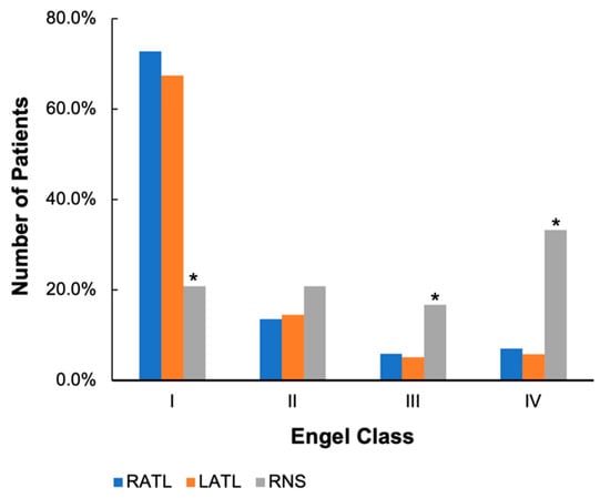 Engel class outcomes. Graph depicts the percent of each cohort represented in the four Engel classes post-intervention. Asterisks represent a statistically significant difference between the RNS cohort and both the LATL and RATL groups.