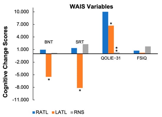 Post-intervention, the RNS and RATL cohorts showed no significant changes in object naming as measured by the BNT or on verbal memory as measured by the Buschke Selective Reminding Test (SRT) [20,21]. However, the LATL cohort showed a significant raw score decline in naming on the BNT (p < 0.005) and in verbal memory on the SRT (p = 0.008) compared to the RNS cohort (Table 5 and Figure 2). The effect size of the BNT is classified as Cohen’s D (0.89–0.92), which is considered large.