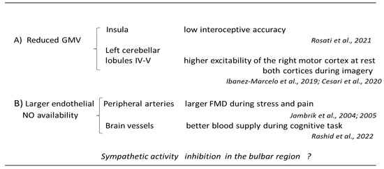 Association between hypnotizability-related morpho-functional differences and behaviour. (A) [14,16,24], at brain level; (B) at vascular level [17,18,20]. FMD, flow-mediated dilation GMV, gray matter volume; NO, nitric oxide.