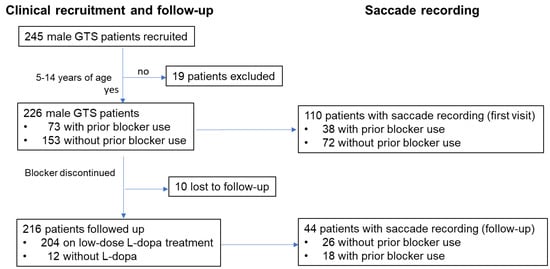 In summary, the findings of the present study clearly showed that dopamine receptor blockers aggravated the symptoms of GTS patients, such as vocal tics and OCD. With development, subscores of motor and vocal tics, as well as OCD, all significantly improved, but the higher vocal tics and OCD subscores in prior blocker users persisted relative to non-users. This suggested that prior use of dopamine receptor blockers may have impaired the function of the oculomotor, as well as the associative circuits, but not the motor circuit, to which the dysfunction of neurotransmitters other than dopamine may also be related. Meanwhile, saccade recordings showed that the pathophysiology of GTS represents a mild basal hypodopaminergic state, improved by L-Dopa administration. L-Dopa use resulted in an improvement of the motor and vocal tic scores, as well as an improvement of the MGS latency and MGS success rate, regardless of blocker use or non-use. This suggests that the use of L-Dopa may have improved the sensorimotor and oculomotor circuits of the basal ganglia–thalamocortical pathway relative to its non-use, but not the affective pathway. In contrast, the OCD subscore was not improved by L-Dopa. The longer VGS latency and the higher saccade to the cue rate in blocker users relative to non-users disappeared with L-Dopa use, but this change may have been due to development rather than L-Dopa use. Indeed, L-Dopa use does not change the frequency of saccades to the cue and increases the latency of VGS in Parkinson’s disease patients [].