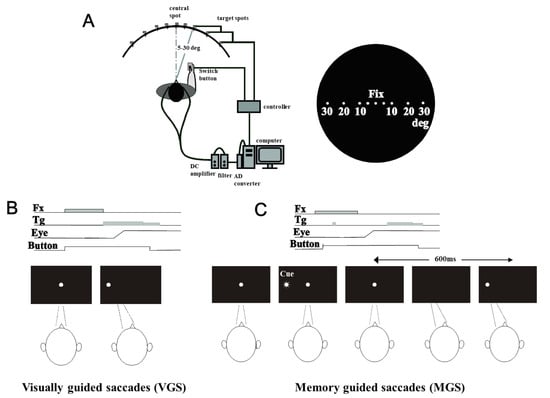 Experimental setup: (A) the electrode and adhesive tape used for recording EOG (B), electrode placement (C), and oculomotor tasks used in the present study (left bottom: VGS, right bottom: MGS). Fx: fixation point, Tg: target, Eye: eye position, Button: button press.