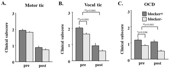 In contrast, the clinical subscores of vocal tics and OCD were initially significantly higher in patients with prior blocker use than in patients without prior use (vocal: p < 0.0001; OCD: p = 0.0186, for vocal tics and OCD, respectively; Figure 3B,C). Both the clinical subscores of vocal tics and OCD decreased significantly during the follow-up period (p < 0.0001, p = 0.0002), which was similar for patients with and without blockers (effect of time: vocal: F = 285.966, p < 0.0001; OCD: F = 14.880, p = 0.0002, interaction between participant group X time: vocal: F = 1.258, p = 0.2633; OCD: F = 3.547, p = 0.0611). At the end of follow-up, the significantly higher vocal tic and OCD subscores in patients with blockers persisted relative to patients without (p = 0.0117, p = 0117 = 0.0004).