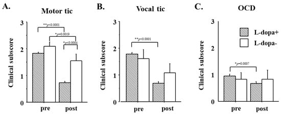 Patients who were started on low-dose L-Dopa at the first visit to the Clinic and those who were not initially showed comparable clinical subscores of motor tics (Figure 4A), vocal tics (Figure 4B), and OCD (Figure 4C; p = 0.4202, p = 0.0591, p = 0.1457, respectively for motor tics, vocal tics, and OCD; Figure 4).