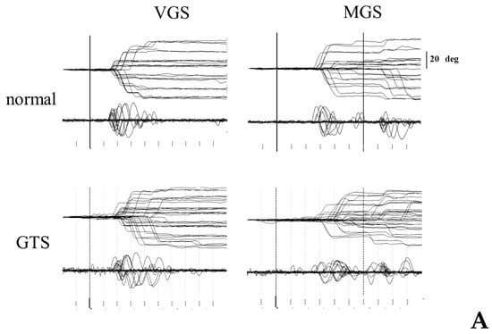 Figure 5A shows typical examples of MGS and VGS traces recorded in a GTS patient (lower row) and an age-matched normal participant (upper row). In this GTS patient, the latency of VGS in most trials was similar to normal participants, although there were some trials with delayed onset, especially for large target eccentricities, and some trials with small target eccentricities showed short latencies. In contrast, the onset of MGS was overall apparently delayed compared to normal participants. In these patients, the saccade traces showed hypometria compared with normal participants, in which the gaze often reached the target location in two or more steps, which was more prominent for MGS than for VGS.