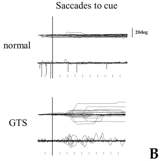 Patients with GTS sometimes inadvertently made a saccade toward the cue presented in the MGS task, although they were instructed not to (Figure 5B). A saccade toward the cue was more frequently observed than in normal participants.