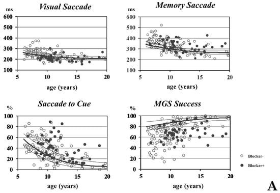 Saccade abnormalities at the first visit to the Clinic were statistically compared between GTS patients with and without prior blocker use and normal control participants. Figure 6A plots the saccade parameters in individual participants against the age of patients with and without prior use of blockers. The black lines indicate the 75th, 50th, and 25th percentiles of the normal range in the control participants, respectively. All saccade parameters exhibited large age-related changes, especially between 5 and 14 years of age. The distribution of VGS latency (upper left figure) showed a slight shift toward a shorter range, whereas saccades to the cue shifted slightly toward a higher range (lower left figure), especially for patients with prior blocker use relative to the normal range. The distribution of MGS latency shifted toward a longer range (upper right figure), and the MGS success rate shifted toward a lower range (lower right figure) for both patients with or without prior use of blockers relative to normal participants.