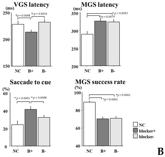 In both patients with and without blockers, the latency of MGS was significantly prolonged and the MGS success rate was significantly reduced compared to normal participants (Figure 6B, upper and lower right figures; an ANOVA showed a significant effect of participant group for both MGS latency and MGS success rate; post hoc analysis showed that both patients who had and had not been taking blockers showed a significantly longer MGS latency compared with control participants (patients with blockers vs. normal control: p = 0.0075, patients without blockers vs. normal control: p = 0.0053), and a significantly lower MGS success rate (patients with blockers vs. normal, patients without blockers vs. normal control: p < 0.0001), whereas the latter two groups were comparable (p = 0.8144)). The accuracy of MGS was comparable in the three groups (p > 0.3 for all comparisons among groups). Patients with and without prior blocker use were also comparable (p = 0.1959).