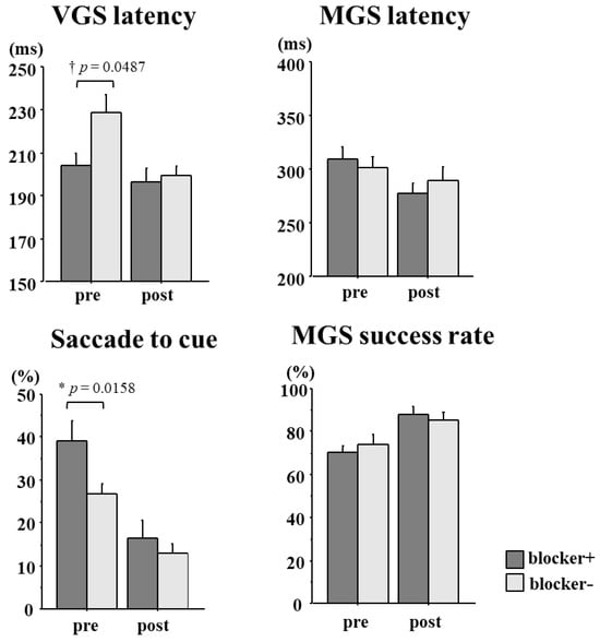 Changes in saccade parameters during follow-up. Saccade parameters were compared at the first visit (pre) and at follow-up (post). Dark gray bars indicate patients with blocker use and light gray bars indicate patients without blocker use. Error bars indicate standard errors. Asterisks indicate significant differences, and daggers indicate a trend for difference.