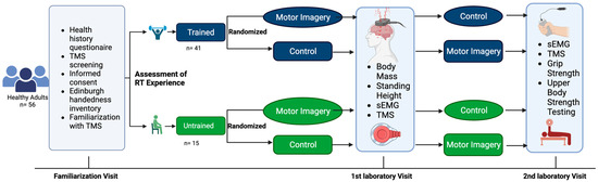 This study utilized a repeated measures design in healthy adults between the ages of 18 and 35 years. The study participants visited the laboratory on three separate occasions, including a familiarization visit. Corticospinal responses were recorded during two conditions: (1) motor imagery of strong, forceful contractions of the hand and wrist flexors and (2) no motor imagery performed (i.e., control). Each participant underwent both conditions (i.e., one per visit). The order of the experimental conditions was randomized. All testing for each participant was separated by at least 24 h and occurred at the same time of the day (±one hour). This study was prospectively registered at ClinicalTrials.gov (Identifier: NCT03889548). The experimental design is illustrated in