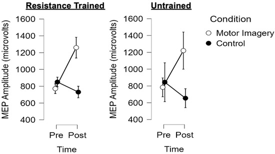 d effect sizes, and 95% confidence intervals (CI). MEP amplitude for the FDI served as the study’s primary dependent variable. Group (trained, untrained) served as a between-subjects factor, whereas time (pre, post) and condition (motor imagery, control) served as within-subject factors. To examine pre–to–post changes in MEP amplitude across groups and conditions, a three-way (group [trained, untrained] × condition [motor imagery, control] × time [pre, post]) mixed factorial analysis of variance (ANOVA) was conducted. In the event of a significant three-way or two-way interaction or main effects for group, condition, or time, Bonferroni-corrected pairwise comparisons were examined. An alpha level of 0.05 was used to determine statistically significant differences. In addition to null hypothesis significance tests, effect sizes via Cohen’s