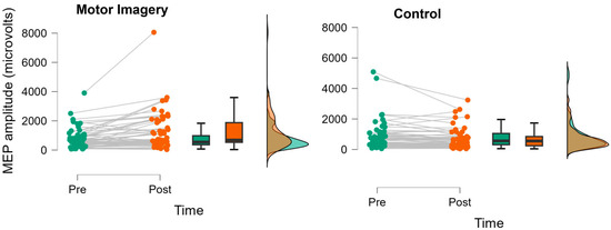 p2 = 0.243). The results from the Bonferroni-corrected pairwise comparisons indicated that motor imagery significantly increased corticospinal excitability (marginal means pre = 784.1 µV, post = 1246.6 µV;