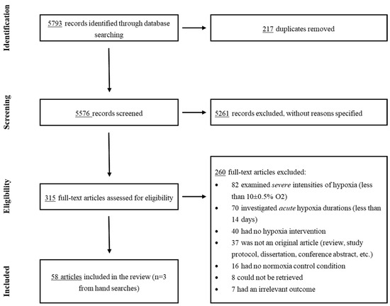 The systematic search, together with additional hand searches, identified 5582 articles (after removal of duplicates), and all these were included for the title/abstract screening (primary screening). Out of these, 315 articles were further evaluated for eligibility through a full-text reading (secondary screening). This resulted in 58 articles that met the inclusion criteria and were thus included in this review (Figure 1 depicts the PRISMA 2020 flowchart). Of these, ten reports were on humans (N = 274 individuals), and the remaining 48 studies were on animal models. Table 1 and Table 2 display the characteristics of the included studies investigating the effects of moderate hypoxia in human and animal subjects, respectively.