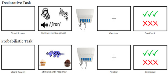 Feedback is an integral part of various teaching methods and intervention techniques used with children. For a learner, it is crucial to use the information carried by external feedback effectively, to guide learning. Recent findings suggest that children with developmental language disorder (DLD) exhibit atypical feedback processing, which may contribute to their difficulties in learning and language acquisition [1,2,3]. Notably, DLD is defined as a neurodevelopmental disorder that affects language development and that cannot be attributed to hearing loss or other known acquired and developmental neurological disorders [4]. Children with DLD also commonly demonstrate weaknesses in cognitive skills such as working memory [5,6,7,8], attention [9,10], and other executive functions [11,12,13]. DLD occurs in approximately 8% of school-aged children [14,15,16], and the potential impacts of DLD are pervasive and severe [17]. Academically, children with DLD are six times more likely to develop a reading disability and four times more likely to develop a math disability compared to peers with typical development (TD) [18]. Children with DLD also have an increased risk of social–emotional challenges and marked difficulties with peer relationships, which extend to adolescence [19,20]. Different brain systems have been implicated in the processing of feedback. Particularly relevant to the study of DLD is the contribution of the striatum and the medial temporal lobe (MTL) to feedback-based learning. The striatum supports reinforcement [21,22,23], while the medial temporal lobe contributes to declarative learning. The relevance of these brain circuits to DLD is rooted in an ongoing debate about the neurophysiological deficit that underlies the disorder. The Procedural Deficit Hypothesis (PDH) suggests that DLD is largely attributed to an abnormal procedural memory system, which contributes to implicit learning [24]. This complex network includes the frontal/striatal circuits that support motor, cognitive, and grammar learning. The PDH further suggests that cognitive processes reliant on the MTL declarative learning system are spared in children with DLD [25]. The question of whether children with DLD derive greater benefit from declarative or probabilistic learning mechanisms remains unsettled. This uncertainty arises from conflicting evidence. One body of research suggests that children with DLD exhibit poor implicit learning and possess a relatively stable declarative learning system [24]. On the other hand, there is ample evidence that children with DLD exhibit limitations in the cognitive resources that are critical for declarative learning (see [26]) and that they benefit when implicit learning principles are implemented during intervention [27,28,29,30,31,32,33]. Evidence of difficulties extracting statistical patterns from linguistic input [24,34,35] and reported abnormalities among individuals with DLD in the striatum and prefrontal cortex [36,37,38,39,40] strengthen the PDH hypothesis. On the other hand, there is evidence that intervention approaches rooted in striatum-based statistical learning facilitate learning in children with DLD [27,28,29,30,31,32,33]. Such methods include increased exemplar variability [27,28,29,30,31,33], auditory bombardment [32], and cross-situational learning [41].