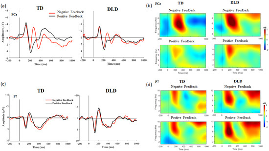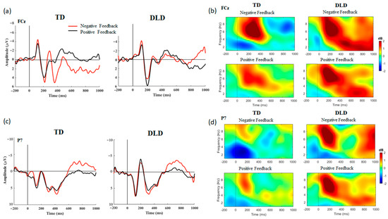 Event-related potentials (left (a,c)) and time–frequency power measures (right (b,d)) measured from electrodes FCz (top (a,b)) to capture the feedback-related negativity (FRN), and P7 (bottom (c,b)) to capture the N170 during a declarative learning task performed by children with typical development (TD) and children with developmental language disorder (DLD). Activation was measured in response to negative- and positive-feedback presentations.