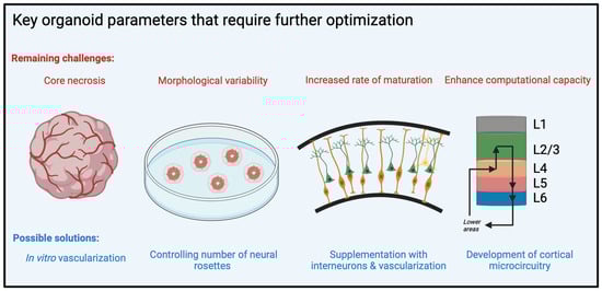 Several strategies have been proposed to accelerate organoid maturation in vitro. Organoid vascularization has been demonstrated using several methods, as discussed above. Such approaches aim to generate organoids containing blood vessels, thereby preventing internal necrosis and more closely approximating normal brain. These studies have reported an increase in mature neurons within organoids, despite the majority lacking fluid flow through their vascular networks. Supplementation of organoids with microglia, a cell type which is absent in current brain organoids, has also been demonstrated to increase neural maturation [,]. Microglia-supplemented organoids were shown to have increased cell maturity based on single-cell transcriptomic analyses as well as more mature electrophysiological properties in multi-electrode array recordings. Notably, this result suggests that supplementation of organoids with other underrepresented cell types, such as inhibitory interneurons, may represent a promising means of accelerating maturation.