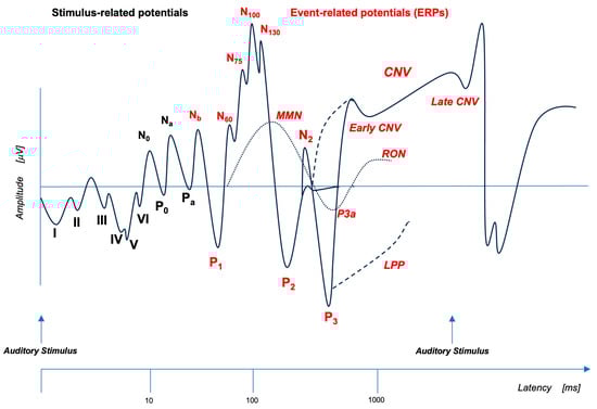 Event-related potentials (ERPs) represent a measure of cortical electric activity evoked during a cognitive task and recorded from scalp with EEG. Here, a schematic representation of auditory ERPs detected after EEG signal averaging analysis is shown in logarithmic temporal sequence. Early responses to auditory stimuli (AEP) are depicted with black letters. Long latency waves, time-locked to the auditory event (ERPs), are depicted with red letters. Each component is described by a letter that indicates its polarity (P: positive and N: negative) and by a number/letter that indicates its position in the sequence or a number that indicates its latency. CNV: contingent negative variation; LPP: late positive potential; MMN: mismatch negativity; RON: reorienting negativity (Adapted from Woodman, 2010 []).