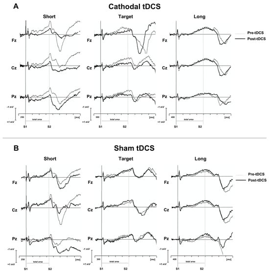 Grand average CNV traces superimposed for pre- and post-tDCS for both (A) cathodal and (B) sham conditions for short, target and long time intervals. Short trial was 800 ms; target trial was 1200 ms; long trial was 1600 ms. S1: warning auditory stimulus (frequency: 1000 Hz; duration: 50 ms; intensity: 60 dB); S2: imperative auditory stimulus (frequency: 1500 Hz; duration: 50 ms; intensity: 60 dB). (from Mannarelli et al., 2023) [].