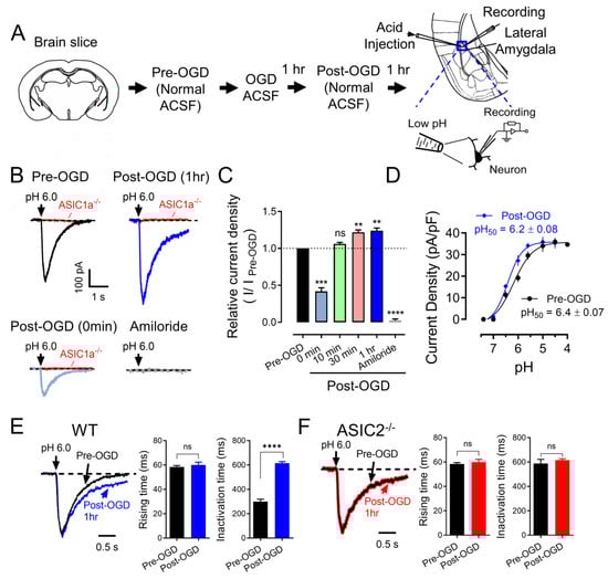 To evaluate whether the expression and function of ASICs are correlated with ischemic conditions in the amygdala, we tested the ASIC currents under an in vitro ischemic stroke condition. OGD, a widely used in vitro model of ischemia, has been shown to increase ASIC currents in cultured cortical neurons [18]. Thus, we examined whether OGD affects ASICs in neurons in the amygdala slices. Amygdala slices were perfused with normal ACSF (bubbled with 5% CO2 and 95% O2) or OGD ACSF (bubbled with 5% CO2 and 95% N2) for 1 h and then returned to normal ACSF, and the ASIC–like current was activated by a pH 6.0 at −70 mV (Figure 1A). Activation of ASIC currents with a 6.0 pH solution was also performed at indicated time points post–OGD (Figure 1B). Consistent with a previous study, we observed a reduction in ASIC currents during OGD treatment, followed by potentiation after OGD treatment in the amygdala slices. (Figure 1B,C). These data suggested that ASICs might be the main target of brain acidosis in the amygdala after ischemia [18]. We also measured the characteristics of the ASICs after OGD. First, we found the OGD condition leftward drifted the ASIC pH dose–dependent curve to more acidification, and the pH50 was changed from pHo 6.4 ± 0.07 to pHo 6.2 ± 0.08, p < 0.001, suggesting that the component of the ASICs was changed after OGD (Figure 1D). Second, we found the ASIC current desensitization time was prolonged after OGD, supporting the above data that the component of ASICs was changed (Figure 1E). ASIC1a and ASIC2 are the two major ASIC components in the central nervous system, and they form heterozygote–functional ASICs. Previous studies showed that with a lack of ASIC2, the current displays a prolonged current desensitization time and a more acidic pH50 [12,26]. We thus concluded that the OGD condition reduces the ASIC2 proteins in the functional ASICs. To further confirm this conclusion, we tested the ASIC current desensitization time in the ASIC2−/− brain slice before and after OGD. Interestingly, no more change in the desensitization time was found in the ASIC2−/− brain slice, supporting the hypothesis that OGD changes the dynamics of the functional ASICs by reducing the ASIC2 percentage (Figure 1F). The extended inactivation time suggests that the total ASIC–conducted ion influx (Na+ and Ca2+) per unit time was increased in the neurons from ASIC2−/− mice, resulting in enhanced neuronal activity.