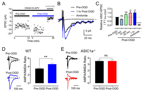 In addition to our investigation of acid–induced ASIC currents, we embarked on an exploration of ASIC1a–dependent excitatory postsynaptic currents (ASIC1a–EPSCs) in response to ischemic conditions (Figure 2A). Building upon our previous data that highlighted H+ as an activator of ASIC1a–EPSCs in the amygdala, our findings introduced the intriguing possibility that H+ and ASIC1a receptors could potentially serve as a neurotransmitter––receptor pair–regulating critical neuronal communication. Guided by this notion, we formulated the hypothesis that transient OGD might bolster the strength of ASIC1a–EPSCs. To evaluate this hypothesis, we employed a strategy involving the inhibition of AMPA receptor (AMPAR), NMDA receptor (NMDAR), and GABA receptor (GABAR)–dependent EPSCs using CNQX, D–APV, and PTX cocktails (Figure 2B). Our results demonstrate a noteworthy enhancement of EPSCs following a mere 10 min of OGD, further corroborated by the inhibitory effects of 200 μM amiloride, an ASIC channel antagonist, underscoring the ASIC1a–dependency of these alterations (Figure 2B,C) [12]. Remarkably, we observed that the potentiation of ASIC1a–EPSCs induced by OGD exhibited a time–dependent characteristic, with peak enhancements occurring approximately 30 min post–OGD (Figure 2B,C). This temporal aspect suggests a dynamic process of synaptic modulation in response to ischemic conditions. It also highlights the potential involvement of ASIC1a in mediating the molecular events that lead to this time–dependent strengthening of synaptic transmission.