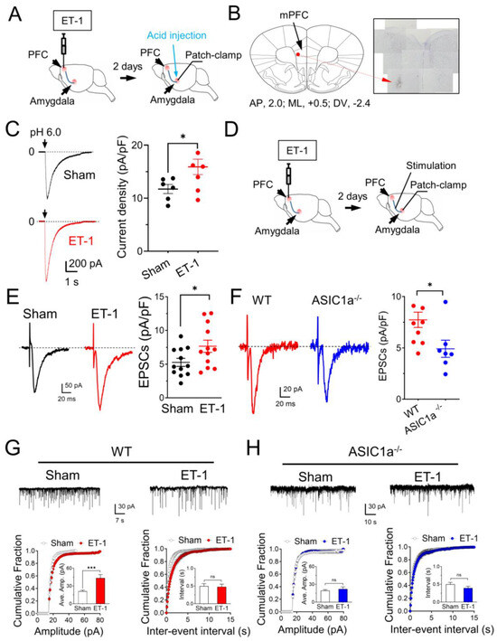 ET–1–induced ischemia in the mPFC potentiates ASIC1a currents and EPSCs in the amygdala. (A) Representative schematic of protocol for ET–1 injection and ASIC current recordings. (B) Example image of crystal violet staining showing the ET–1–induced ischemia in the mPFC. (C) Representative traces (left) and summarized data (right) of pH 6.0–induced currents in the amygdala before and after ET–1 injection in the mPFC. n = 6 cells in 4 mice. (D) Representative schematic of protocol for ET–1 injection and EPSC recordings. (E) Representative traces (left) and summarized data (right) of EPSCs in the amygdala before and after ET–1 injection in the mPFC. n = 12 cells in 4 mice. (F) Representative traces (left) and summarized data (right) of EPSCs in the amygdala after ET–1 injection in the WT and ASIC1a−/− mPFC, respectively. n = 8 cells in 4 mice. (G) Upper, representative mEPSC traces in the sham and ET–1 injection groups; lower, cumulative distributions of mEPSC amplitudes and inter–event intervals in the sham (black) and ET–1 injection (red) WT mice. Insets are the summarized data of amplitudes and inter–event intervals. (H) The mEPSC results in the sham (black) and ET–1 injection (blue) ASIC1a−/− mice. ‘n.s.’ indicates not statistically significant. * p < 0.01, *** p < 0.0001, by unpaired Student’s t-test. Data are mean ± SEM.
