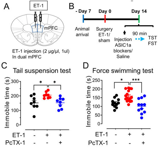 ET–1–induced focal ischemia in the mPFC potentiates depression–like behaviors. (A) Schematic of protocol for ET–1 injection in dual mPFC. (B) Representative schematic of behavioral paradigm. (C) The summarized results of the tail suspension test. The injection of 1 µM ET–1 and 100 nM PcTx–1 are indicated in B. n = 8 mice in each group. (D) The summarized results of the forced swimming test. n = 11–16 mice in each group. * p < 0.05, *** p < 0.001, by one–way ANOVA with Tukey’s post–hoc multiple comparisons. Data are mean ± SEM.