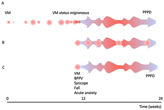 Vestibular migraine—episodic to chronic symptoms. This is a diagrammatic representation of the interplay and transition from vestibular migraine (VM), status migrainosus and persistent postural-perceptual dizziness (PPPD), proposing different paths for how chronic vestibular symptoms may arise. (A) The development of persistent postural-perceptual dizziness from recurrent episodes of vestibular migraine. (B) In patients with established PPPD, recurrent episodes of VM may occur on the background of chronic vestibular symptoms. (C) Alternatively, PPPD can arise from a single episode that impairs or threatens normal balance (e.g., VM, BPPV, or syncope). The size of the circles represents the severity of the attack in time, and the colour, its severity in functional burden (red representing maximal symptom burden). Abbreviations: BPPV, benign paroxysmal positional vertigo; PPPD, persistent postural perceptual dizziness; VM, vestibular migraine.