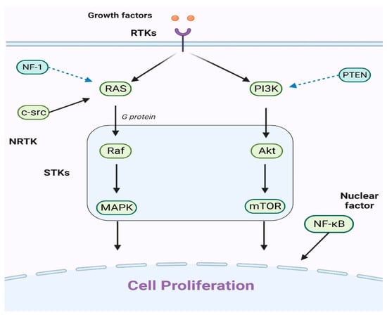 An explanation of the primary cell proliferation pathways: The PI3K/Akt/mTOR and Ras/Raf/MAPK routes are the main pathways. When growth factors attach to receptor tyrosine kinases (RTKs), they can trigger either the Ras/Raf/MAPK or PI3K/Akt/mTOR pathways. The key players in these pathways, Raf, MAPK, Akt, and mTOR, have been identified as serine/threonine-specific protein kinases (STKs). Additionally, the intracellular tyrosine kinase c-src can initiate the Ras/Raf/MAPK pathway. It is worht noting that the nuclear factor NF-κB also significantly contributes to cell proliferation.