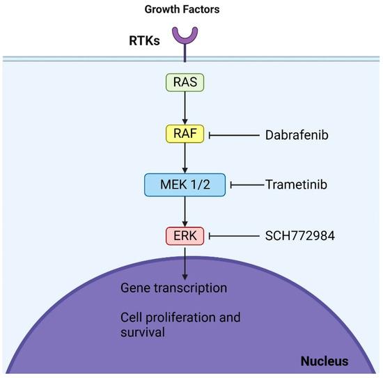 Mechanisms of action of dabrafenib and trametinib: These agents, which are BRAF and MEK inhibitors, respectively, act at two distinct sites within the MAPK (mitogen-activated protein kinase) pathway. By binding to their respective targets, they halt the oncogenic signaling cascade, culminating in cell cycle arrest.