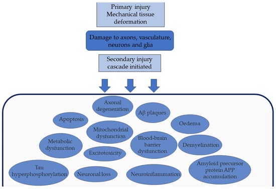 It is necessary to consider TBI as a ‘polypathology’ as we gain an appreciation of how different disease processes form a conglomerate of neuropathology, with a devastating burden on the individual and society []. Whilst mTBI and severe TBI (sTBI) are differentiated using the Glasgow Coma Scale (GCS) [], there is a growing appreciation of the overlap of the neuropathological consequences of repetitive mTBI and a single moderate or severe TBI []. A 2019 review of the current pathology observed in mTBI and sTBI suggested the concept of a ‘TBI dose effect’, as multiple mTBIs or a single sTBI could similarly contribute to a threshold that triggers a neurodegenerative response []. Our understanding of the neurodegeneration that follows TBI has expanded rapidly in the past few decades. We have identified many mechanisms following the primary mechanical injury and how they interact, as seen in Figure 1.
