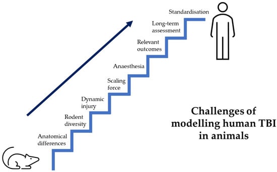 We know that TBI evolves over years and neuroinflammation is seen to persist for many years []. However, a very small proportion of preclinical trials report looking at outcomes beyond 1 month [], which limits our ability to make valid conclusions about the long-term sequelae of human TBI. Some of these limitations are shared by all models previously discussed and an overview of the barriers to a clinically translatable animal model of human TBI is illustrated below (Figure 2).