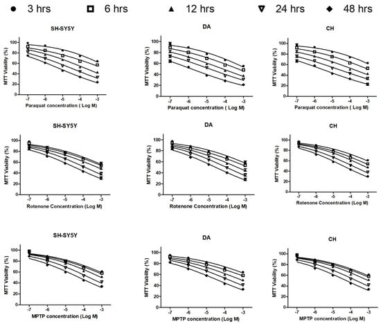 The cytotoxic effect of PQ, RO, and MPTP on undifferentiated SH-SY5Y cells and CH and DA cells was evaluated using a 3-(4,5-dimethylthiazol,2-yl)-2,5-diphenyl tetrazolium bromide (MTT) assay. The MTT assay was employed as a general cell viability assay reliant on the ability of healthy cells to reduce the MTT substrate to insoluble formazan primarily through the activity of NADPH oxidoreductase enzymes []. Assay optimization was undertaken to ensure that the MTT signal was linear over the course of the assay (up to 48 h) and with the number of cells seeded (refer to Supplementary Figure S2) and conducted according to a previous publication []. Briefly, SH-SY5Y cells were subcultured in a 96-well plate and either grown undifferentiated (seeded at 1 × 104 cells/well) or differentiated into either CH or DA neuronal phenotypes. SH-SY5Y cells were treated with PQ, RO, or MPTP at concentrations of 0.1, 1, 10, 100, or 1000 μM for 3, 6, 12, 24, and 48 h. A total of 10 µL of MTT reagent was added to each well for undifferentiated SH-SY5Y cells, and 15 µL was added to the wells containing differentiated CH or DA cells to ensure the MTT signal was sufficient for the experimental time course. Cells were incubated for 2 h, after which 100 µL of solubilizing reagent was added to each well. After 1 h of incubation, the absorbance at 590 nm was read using a Dyne MRX micro-plate reader (Dyne technologies, Chantilly, VA, USA) after shaking at medium speed for 30 s. MTT absorbance values were expressed as a percentage of the corresponding value of controls (assumed to be 100% viability) after subtracting values from blank wells. Each treatment was performed in triplicate per experimental plate, and each experiment was performed at least three times.