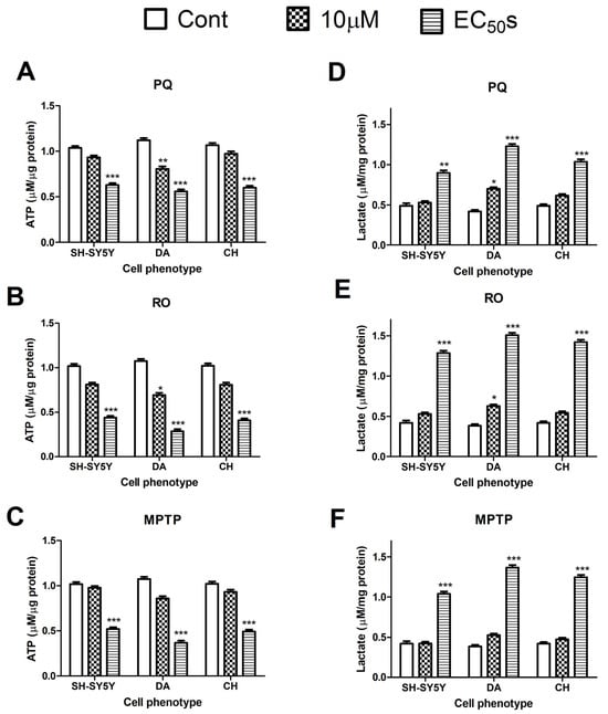 The effects of the neurotoxicants on cellular ATP and lactate levels. Undifferentiated human neuroblastoma cells (SH-SY5Y) or differentiated dopaminergic (DA) or cholinergic (CH) cells were treated with paraquat (PQ), rotenone (RO), or MPTP, and the levels of ATP (A–C) and lactate (D–F) were quantified. Neurotoxicants were applied at concentrations of 10 µM as well as at their MTT-estimated EC50s (PQ at concentrations of 35, 15, and 25 µM; RO at concentrations of 150, 90, and 120 µM; and MPTP at concentrations of 150, 170, and 250 µM for SH-SY5Y, DA, and CH cells, respectively) for 24 h. After subtraction of the blank readings from all values, readings were generated using standard curves. ATP and lactate levels were normalized to the cellular protein concentrations of the corresponding samples. All experiments were performed in triplicate. Data were expressed as means ± SD. A two-way ANOVA with a Bonferroni post-test was used to compare the different sets of data. For marked significance, * p < 0.05, ** p < 0.01, *** p < 0.001.