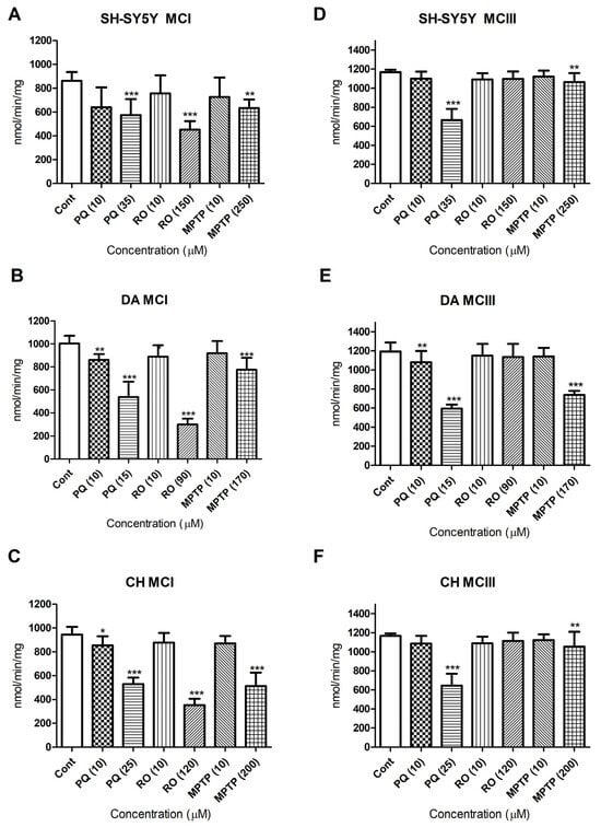 To assess the impact of the neurotoxicants on mitochondrial functioning, mitochondrial activity assay measurements were undertaken. Activity assays for mitochondrial complexes I and III were performed after treatment with PQ, RO, or MPTP at their estimated MTT EC50 concentrations (15, 90, and 150 µM, respectively) and at a lower concentration of 10 µM for 24 h.