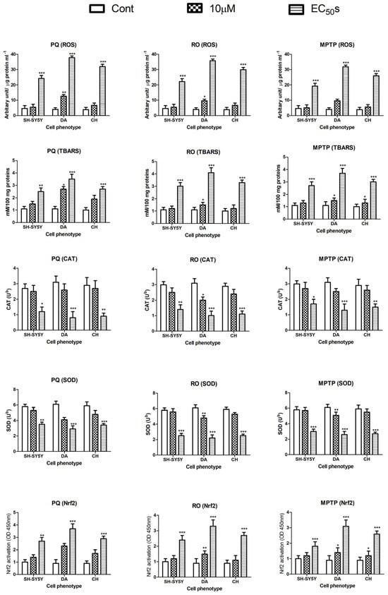 The effect of neurotoxicants on markers of oxidative stress. The levels of reactive oxygen species (ROS), thiobarbituric acid reactive substances (TBARS), catalase (CAT) activities, superoxide dismutase (SOD) activities, and nuclear NF-E2-related factor 2 (NRf2) were quantified in response to neurotoxicant incubations with undifferentiated human neuroblastoma cells (SH-SY5Y) and differentiated dopaminergic (DA) and cholinergic (CH) cells. The neurotoxicants were applied at concentrations of 10 µM as well as their MTT-estimated EC50s (PQ at concentrations of 35, 15, and 25 µM; RO at concentrations of 150, 90, and 120 µM; and MPTP at concentrations of 150, 170, and 250 µM for SH-SY5Y, DA, and CH cells, respectively) for 24 h. Data are presented as means ± SD. A two-way ANOVA with a Bonferroni post-test was performed to compare the different sets of data. For marked significance, * p < 0.05, ** p < 0.01, *** p < 0.001.