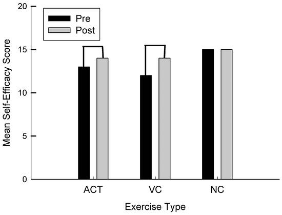 For self-efficacy, there was a significant difference in the VC intervention t(9) = −3.25, p = 0.005 in which self-efficacy improved from pre to post. As can be seen in Figure 1, For the ACT intervention, there was a trend toward conventional levels of significance t(11) = −1.40, p = 0.095 in which self-efficacy improved from pre to post. There were no differences in the NC intervention.
