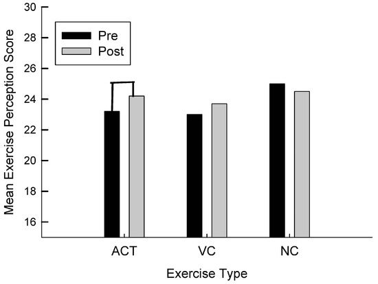 Mean exercise perception score as a function of group (ACT, VC, NC) and time (pre, post).