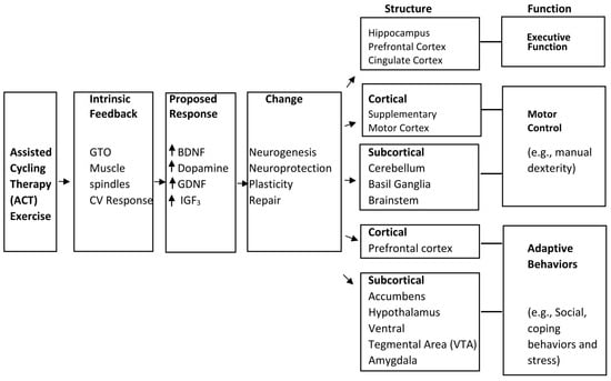 Neural plasticity and repair and their effects on cognitive and motor behaviors have been studied as they relate to ACT exercise. In a study conducted by Alberts and colleagues [24], Parkinson’s patients were found to pedal at a faster and a more steady pace through ACT than through VC. This increased the quality and amount of intrinsic neural feedback from the muscles to the brain causing neurotrophic factors BDNF, GDNF, and IGF3 to be released in the brain. These factors relate to neural plasticity and neurogenesis, both of which would further synaptic connections, thus training muscle habits in participants giving us the belief that improvements in cognition are possible. As can be seen in Figure 3, it has been suggested that these factors of neural plasticity and neurogenesis may increase learning memory, motor control, and behavioral adaptations [24]. By creating more nervous tissue and nervous tissue connections, the brain is able to operate at an increased level of connection.