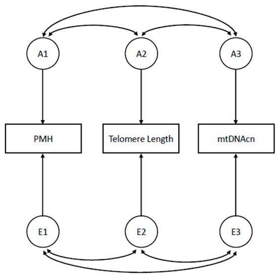 Correlated Factors Model for the estimation of genetic and environmental correlations between PMH traits and aging biomarkers. Note: Ai, genetic factors influencing study variables; Ei, environmental factors influencing study variables; PMH, Positive Mental Health trait; mtDNAcn, mitochondrial DNA copy number; double-headed arrows are correlations between (genetic or environmental) factors influencing study variables.
