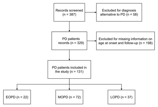 Flowchart of patient selection for the study. EOPD: Early-Onset-PD; MOPD: Middle-Onset-PD; LOPD: Late-Onset-PD; PD: Parkinson’s disease.