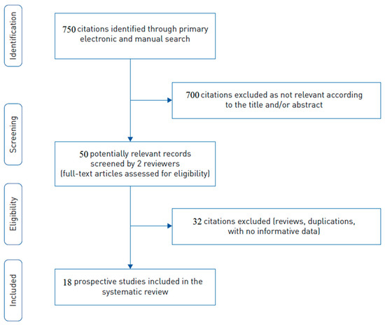 According to the purpose of the study, the initial search returned over 750 studies with pertinent information using keywords and references. After titles and abstracts were checked, complete texts were examined, and 18 papers were found to meet the criteria for admission, with a total number of 1025 patients (Figure 1).